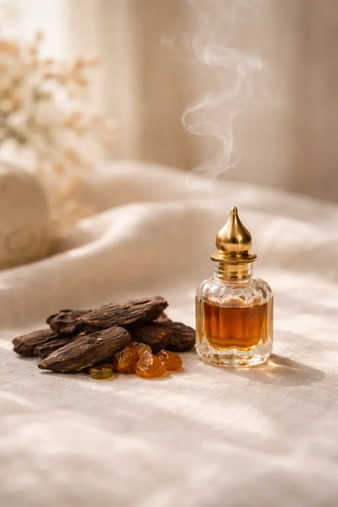 This longevity is one of Oud’s most prized characteristics. In the sweltering heat of the Middle East and South Asia, lighter perfumes evaporate quickly, leaving no trace. Oud, however, endures. Its heavy molecular structure allows it to cling to skin and fabric for days, creating a personal aura that surrounds the wearer. To enhance this richness, perfumers often blend Oud with other luxurious natural materials. A classic combination pairs the dark intensity of agarwood with the creamy, milky softness of Sandalwood oil, which smooths rough edges and adds a soothing, meditative quality to the fragrance.